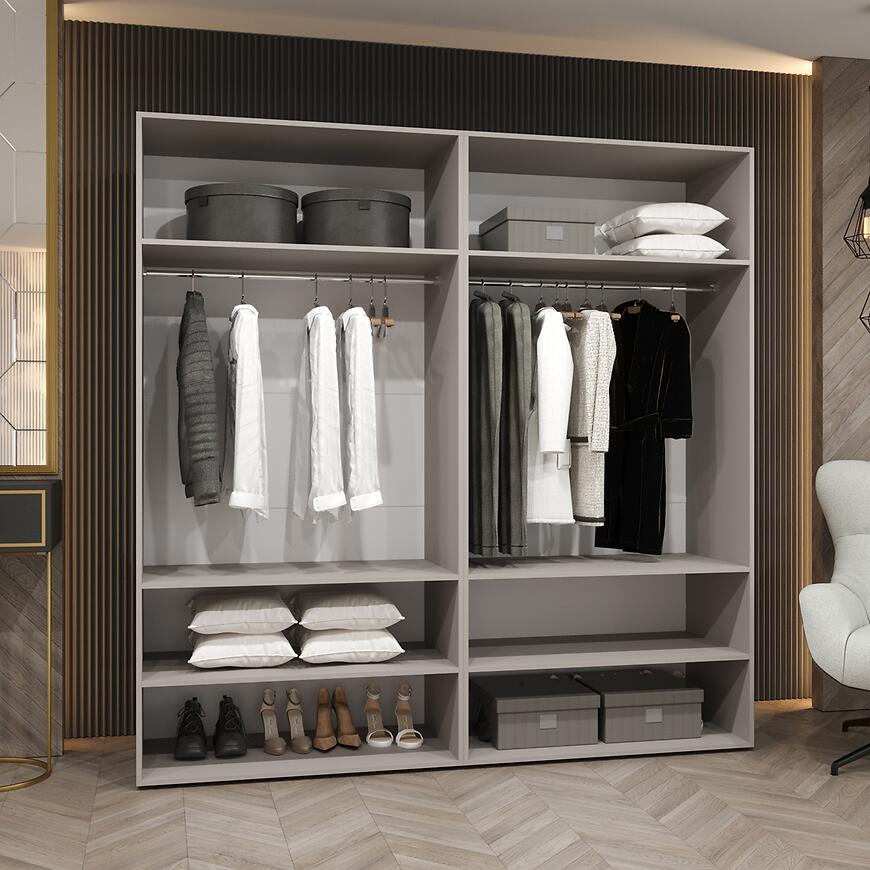Kilkudrzwiowa konstrukcja umożliwia wygodny dostęp do wnętrza, a stabilna konstrukcja o wadze 134,3 kg gwarantuje trwałość i solidność szafy. Brak lustra pozwala zachować jednolity design bryły, a prostota i elegancja pozostają dominującymi elementami.