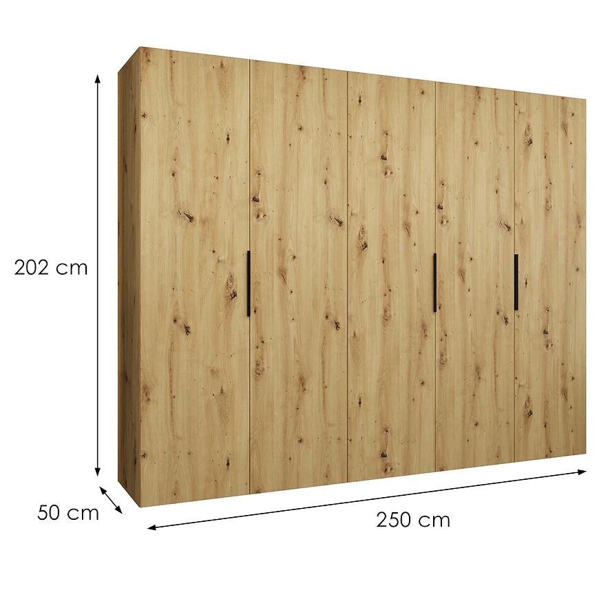Dzięki wymiarom 250 cm szerokości, 202 cm wysokości i 50 cm głębokości, szafa oferuje ogromną przestrzeń do przechowywania, idealną do uporządkowania garderoby i akcesoriów. Model należy do kategorii szaf kilkudrzwiowych bez lustra, co pozwala zachować minimalistyczny, estetyczny wygląd bryły.