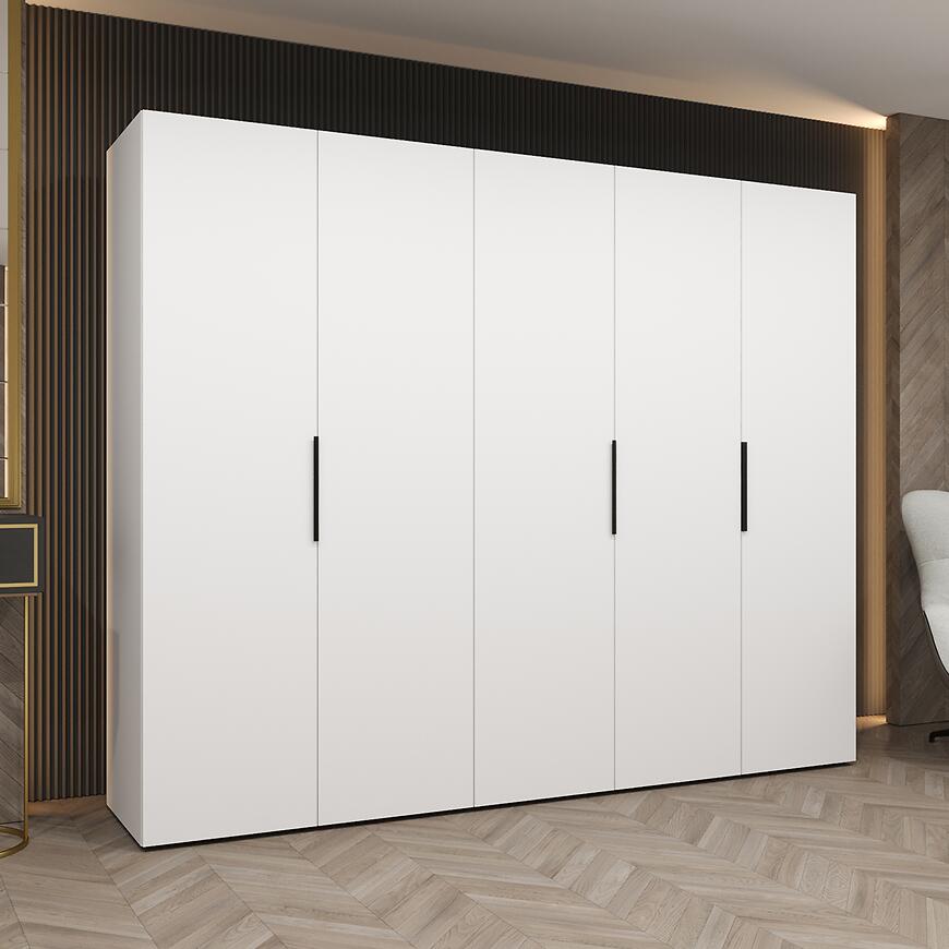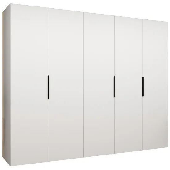 Szafa Marbella I 250 biały/czarny to propozycja dla osób poszukujących kilkudrzwiowej szafy 250 cm w nowoczesnym stylu, z matowym wykończeniem i kontrastującymi czarnymi detalami.
