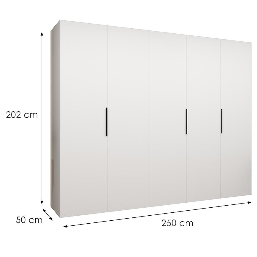 Dzięki wymiarom 250 cm szerokości, 202 cm wysokości i 50 cm głębokości, szafa oferuje ogromną przestrzeń do przechowywania, idealną do uporządkowania garderoby i akcesoriów. Model należy do kategorii szaf kilkudrzwiowych bez lustra, co pozwala zachować minimalistyczny i estetyczny wygląd bryły.