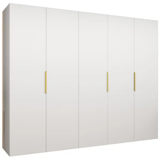 Szafa Marbella I 250 biały/złoty to propozycja dla osób poszukujących kilkudrzwiowej szafy 250 cm w nowoczesnym stylu, z matowym wykończeniem i subtelnymi złotymi detalami.
