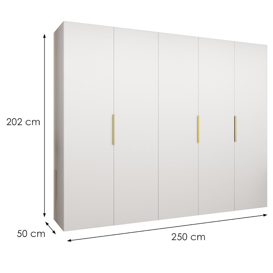 Dzięki wymiarom 250 cm szerokości, 202 cm wysokości i 50 cm głębokości, szafa oferuje dużą przestrzeń do przechowywania, idealną do uporządkowania odzieży i akcesoriów. Model należy do kategorii szaf kilkudrzwiowych bez lustra, co pozwala zachować minimalistyczny i elegancki wygląd bryły.