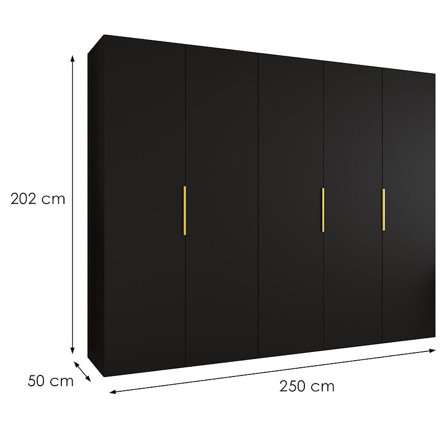 Dzięki wymiarom 250 cm szerokości, 202 cm wysokości i 50 cm głębokości, szafa oferuje dużą przestrzeń do przechowywania, umożliwiając wygodne uporządkowanie odzieży i dodatków. Model należy do kategorii szaf kilkudrzwiowych bez lustra, co pozwala zachować minimalistyczny i spójny wygląd bryły.
