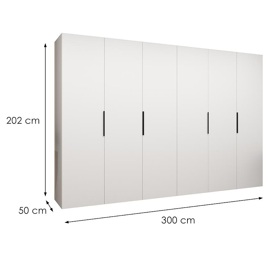 Szafa Marbella I 300 biały/czarny to propozycja dla osób, które potrzebują dużej i funkcjonalnej szafy. Dzięki szerokości 300 cm, wysokości 202 cm i głębokości 50 cm oferuje znaczną przestrzeń do przechowywania odzieży i dodatków, jednocześnie zachowując elegancki wygląd.