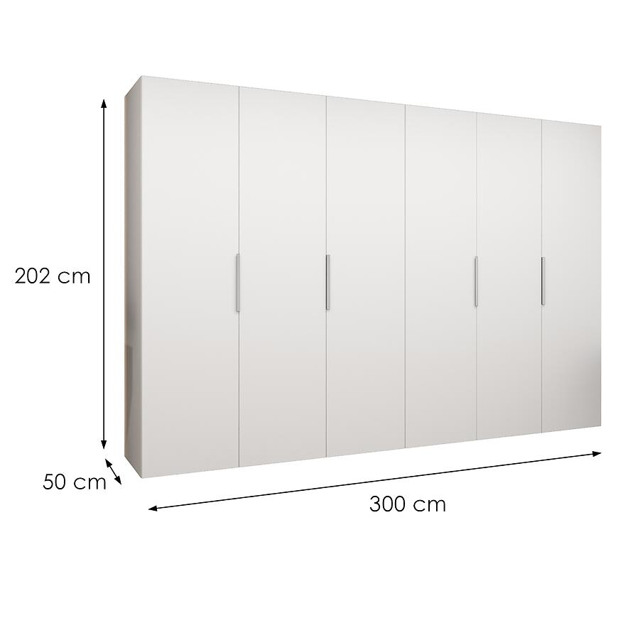 Szafa Marbella I 300 biały/srebrny łączy w sobie dużą pojemność i nowoczesny design. Dzięki szerokości 300 cm, wysokości 202 cm i głębokości 50 cm oferuje dużo miejsca na odzież i dodatki, zapewniając wygodę codziennego użytkowania.
