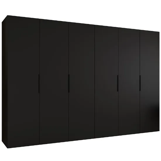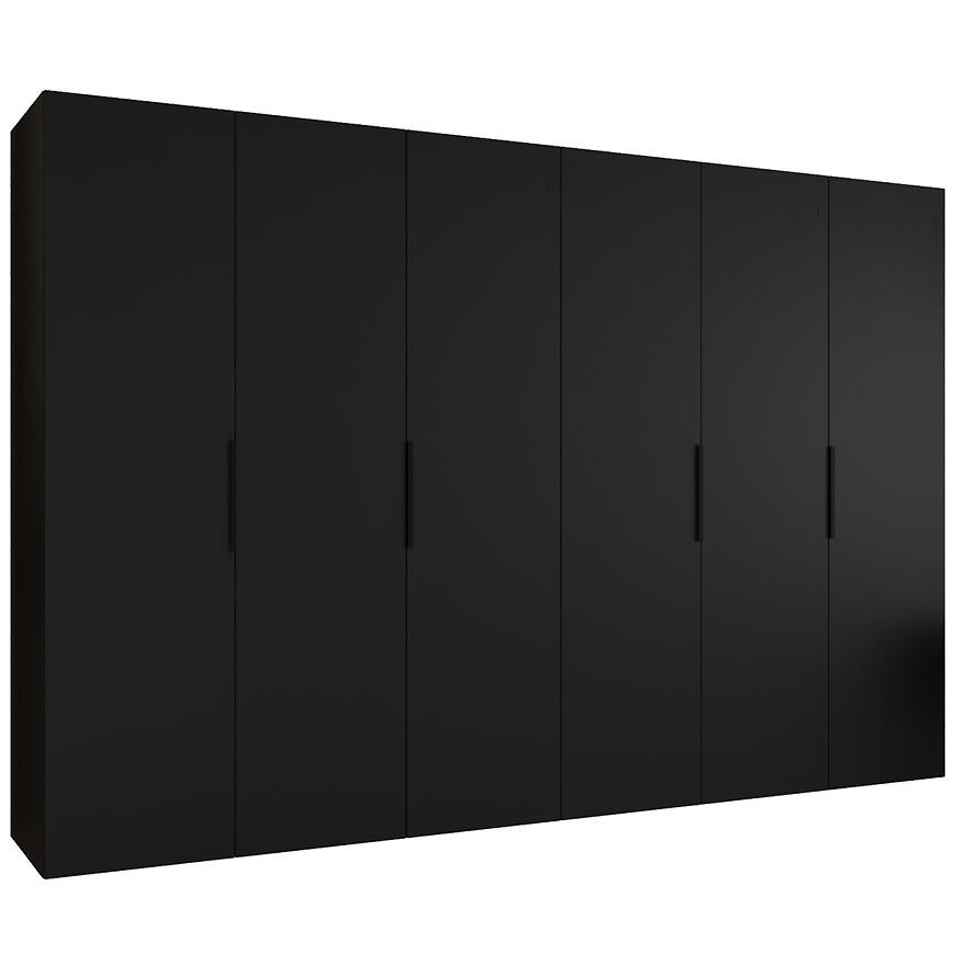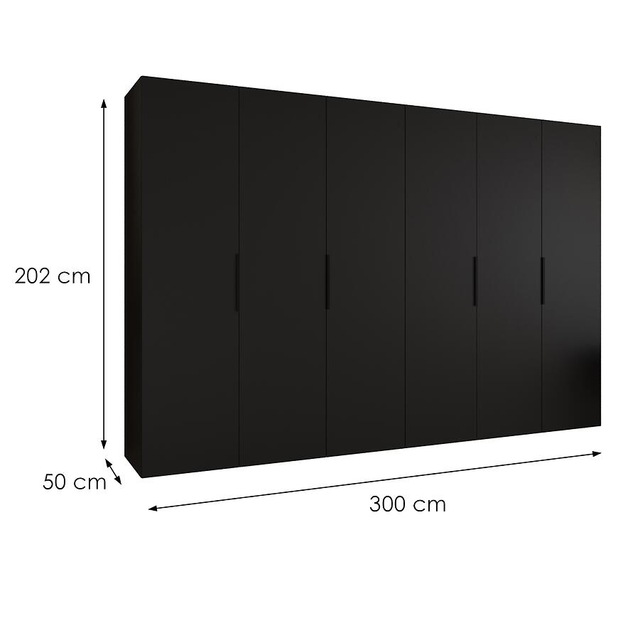Szafa Marbella I 300 czarny to połączenie dużej pojemności i nowoczesnego designu. Z wymiarami 300 cm szerokości, 202 cm wysokości i 50 cm głębokości zapewnia obszerną przestrzeń do przechowywania ubrań i dodatków. Jej kilkudrzwiowa konstrukcja ułatwia organizację, a klasyczne drzwi podkreślają minimalistyczny styl.