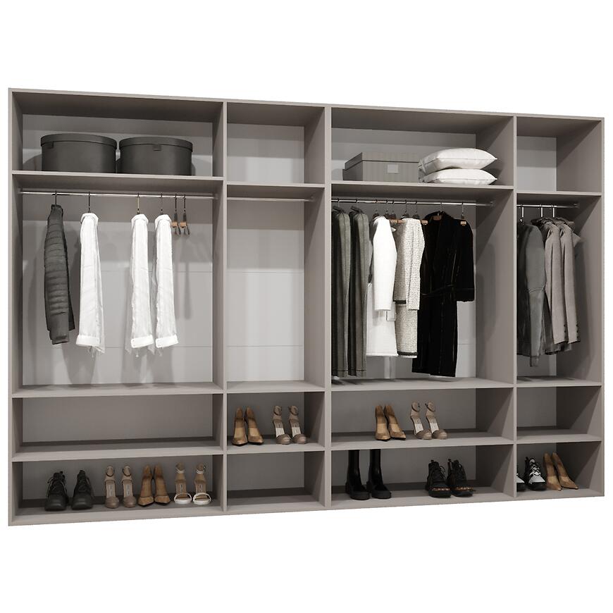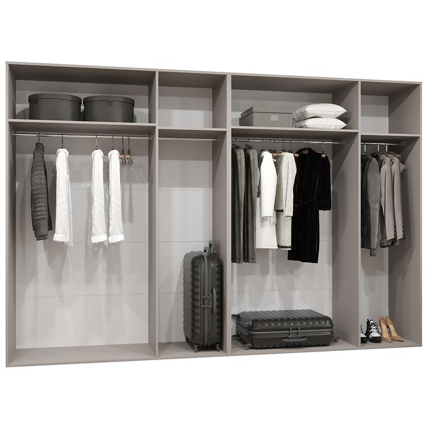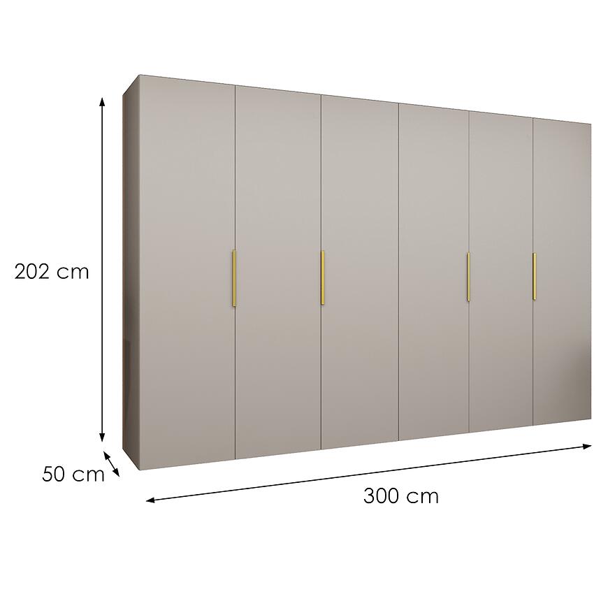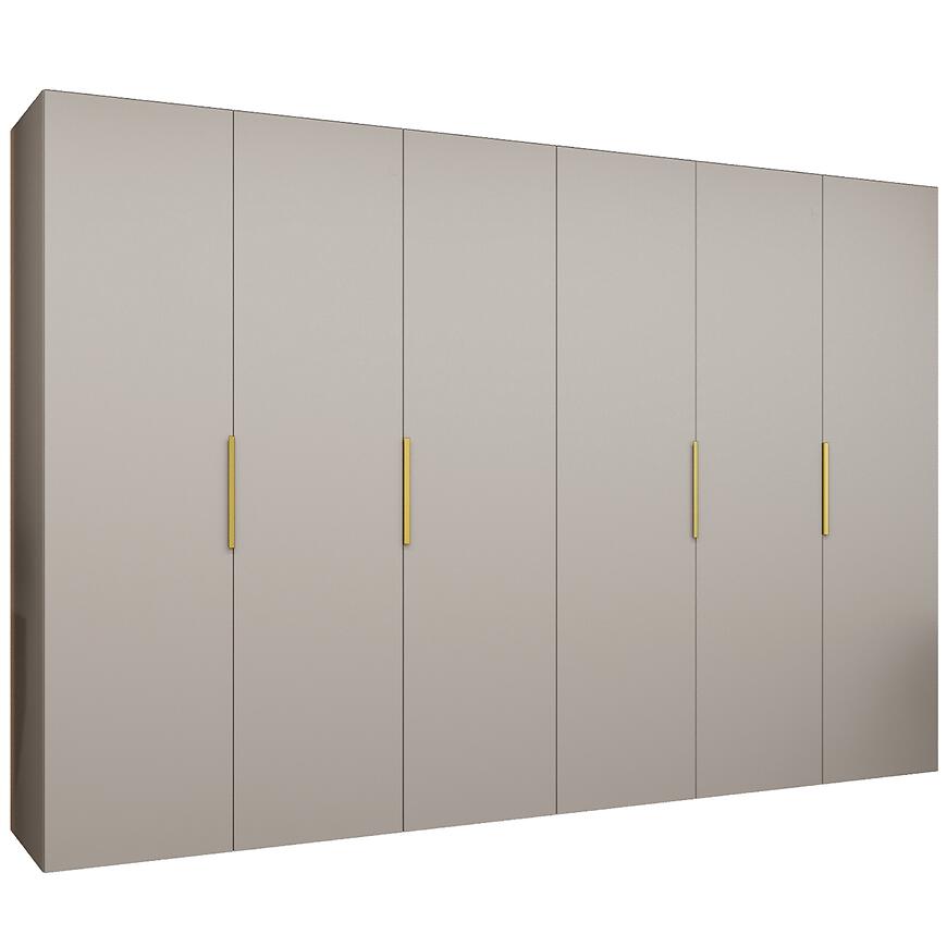 Szafa Marbella I 300 kaszmir/złoty łączy dużą pojemność z nowoczesnym designem. Dzięki wymiarom 300 cm szerokości, 202 cm wysokości i 50 cm głębokości, zapewnia przestronną powierzchnię do przechowywania odzieży i akcesoriów. Kilkudrzwiowa konstrukcja z klasycznymi drzwiami umożliwia wygodny dostęp do wnętrza, a kolor kaszmir w połączeniu ze złotymi detalami nadaje meblowi elegancki i prestiżowy charakter.