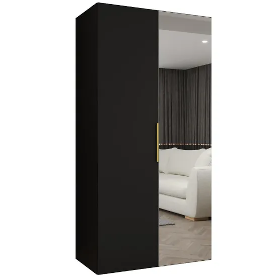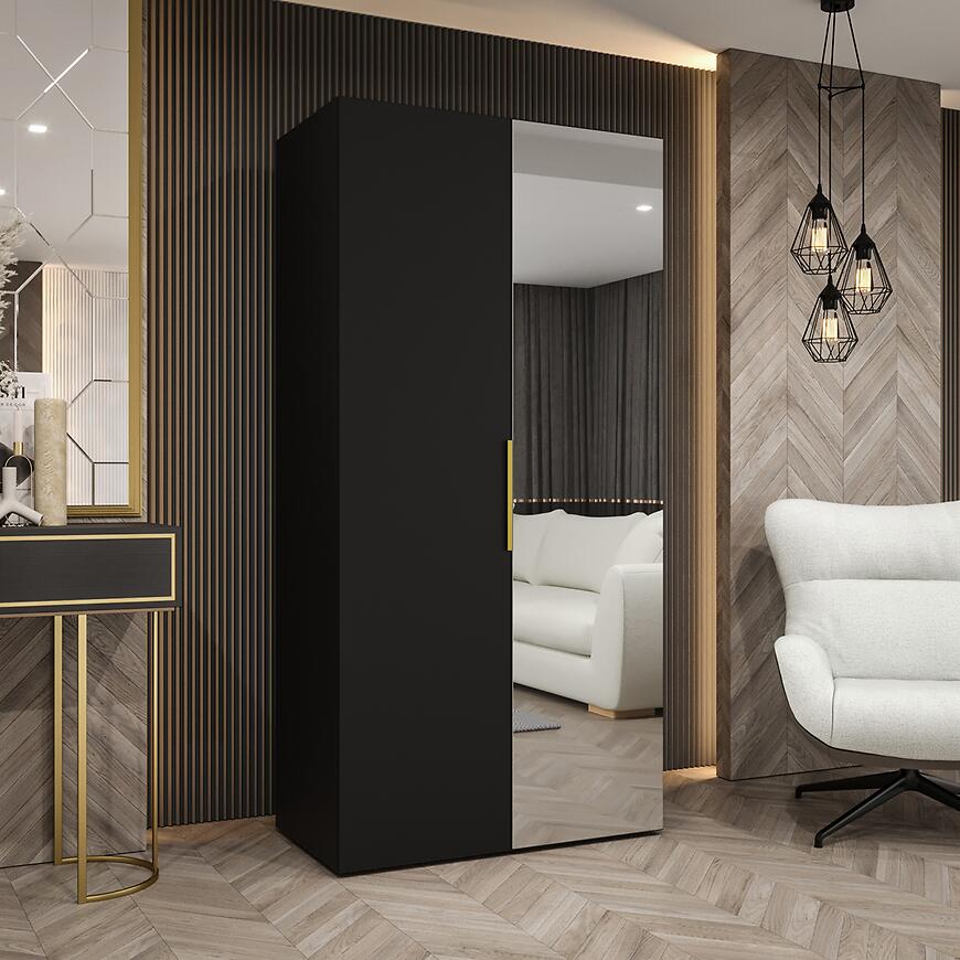 Szafa Marbella II 100 czarny/złoty to elegancki mebel o minimalistycznej, prostej bryle, łączący funkcjonalność z nowoczesnym designem. Czarny kolor frontów i korpusu został podkreślony subtelnymi złotymi detalami, które nadają bryle wyjątkowego charakteru, jednocześnie podkreślając stylowy i nowoczesny wygląd. Matowe wykończenie frontów i korpusu sprawia, że szafa prezentuje się elegancko, a powierzchnia jest łatwa w utrzymaniu czystości.