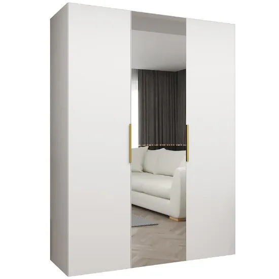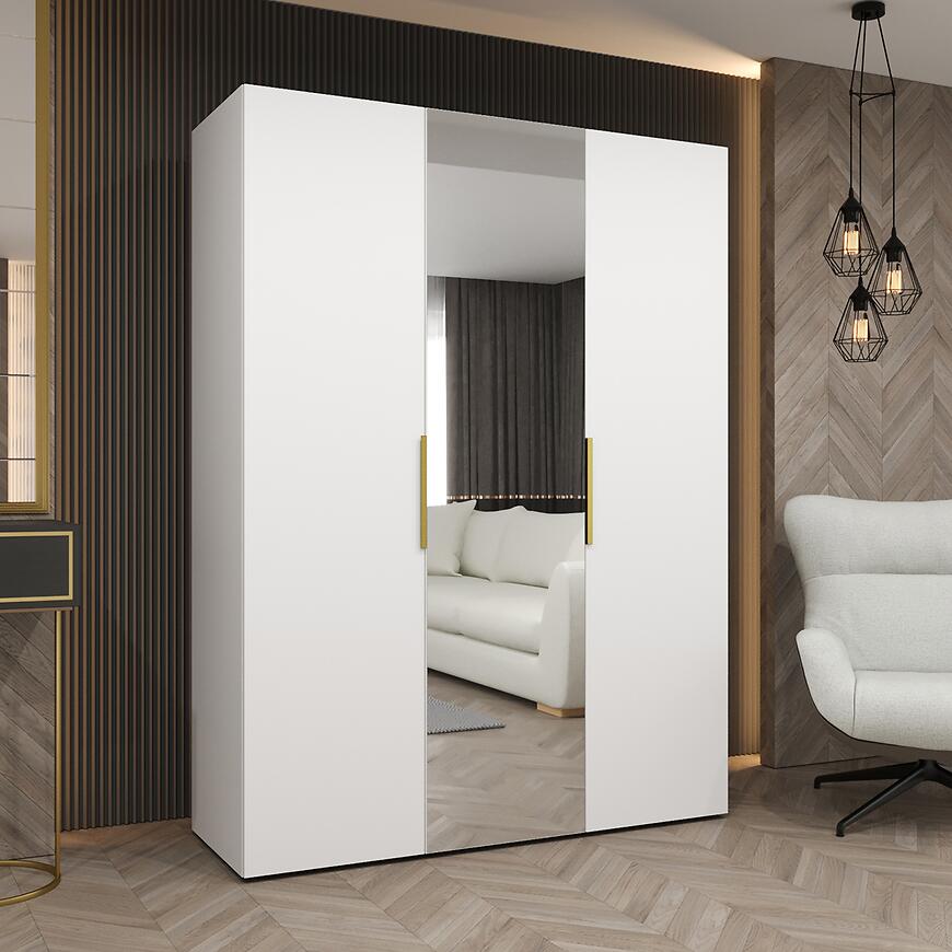 Szafa Marbella II 150 biały/złoty to przestronny mebel o minimalistycznej, prostej bryle, łączący elegancję z funkcjonalnością. Biel frontów i korpusu w połączeniu z matowym wykończeniem nadaje szafie nowoczesny wygląd, a subtelne złote detale podkreślają styl i charakter mebla. Trzydrzwiowa konstrukcja z klasycznymi drzwiami oraz lustro na froncie sprawiają, że szafa jest praktyczna i estetyczna.