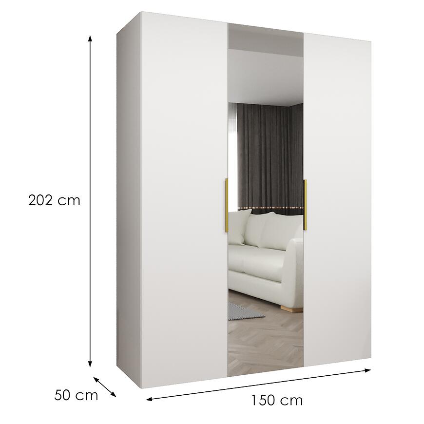Model posiada szerokość 150 cm, wysokość 202 cm oraz głębokość 50 cm, co zapewnia dużą przestrzeń do przechowywania przy zachowaniu proporcjonalnych wymiarów. Symetryczny układ drzwi i minimalistyczne detale wzmacniają nowoczesny design szafy, a lustro optycznie powiększa przestrzeń wokół mebla.