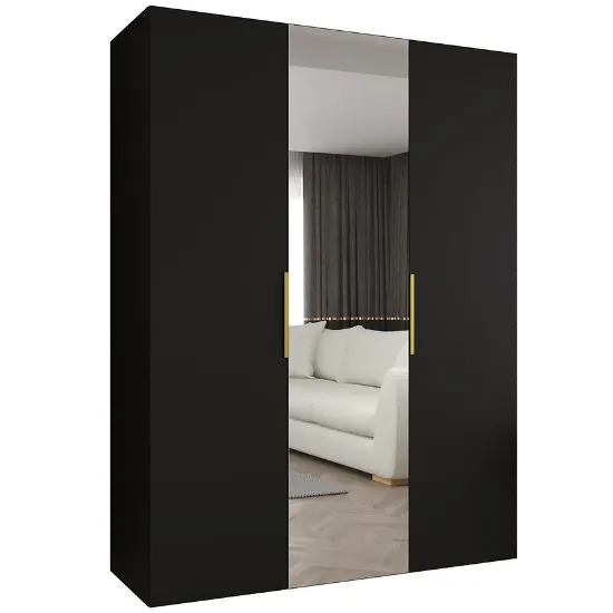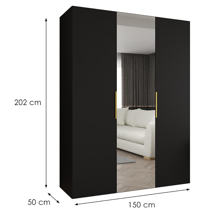 Szafa Marbella II 150 czarny/złoty to przestronny mebel o minimalistycznej, prostej bryle, łączący elegancję z funkcjonalnością. Czarne wybarwienie frontów i korpusu w połączeniu z matowym wykończeniem nadaje szafie nowoczesny wygląd, a subtelne złote akcenty dodają luksusowego charakteru. Trzydrzwiowa konstrukcja z klasycznymi drzwiami oraz lustro na froncie sprawiają, że szafa jest praktyczna i estetyczna.