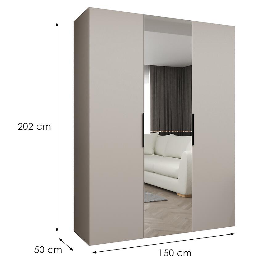 Model posiada szerokość 150 cm, wysokość 202 cm oraz głębokość 50 cm, co zapewnia dużą przestrzeń do przechowywania. Symetryczny układ drzwi i minimalistyczne detale wzmacniają nowoczesny design szafy, a lustro optycznie powiększa przestrzeń wokół mebla.