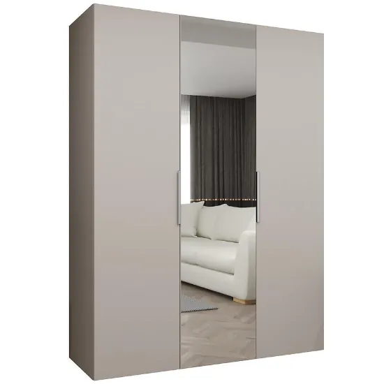 Szafa Marbella II 150 kaszmir/srebrny to przestronny mebel o minimalistycznej, prostej bryle, łączący elegancję z funkcjonalnością. Beżowe wybarwienie kaszmir frontów i korpusu w połączeniu z matowym wykończeniem nadaje szafie nowoczesny wygląd, a subtelne srebrne akcenty podkreślają charakter i styl mebla. Trzydrzwiowa konstrukcja z klasycznymi drzwiami oraz lustro na froncie sprawiają, że szafa jest praktyczna i estetyczna.