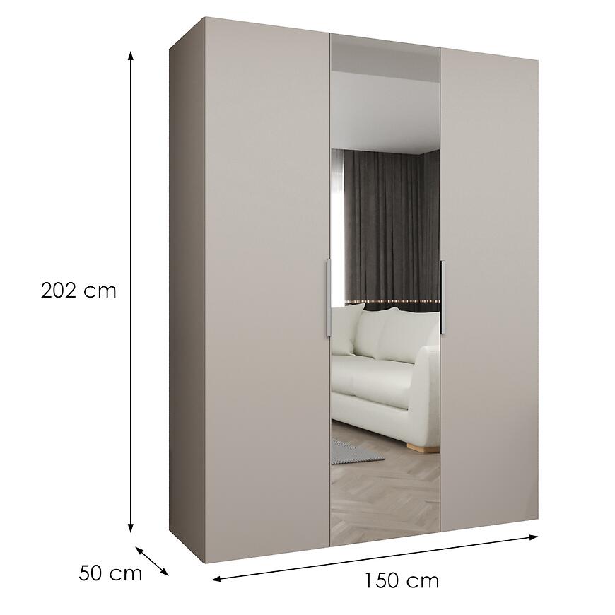 Model posiada szerokość 150 cm, wysokość 202 cm oraz głębokość 50 cm, co zapewnia dużą przestrzeń do przechowywania. Symetryczny układ drzwi i minimalistyczne detale wzmacniają nowoczesny design szafy, a lustro optycznie powiększa przestrzeń wokół mebla.