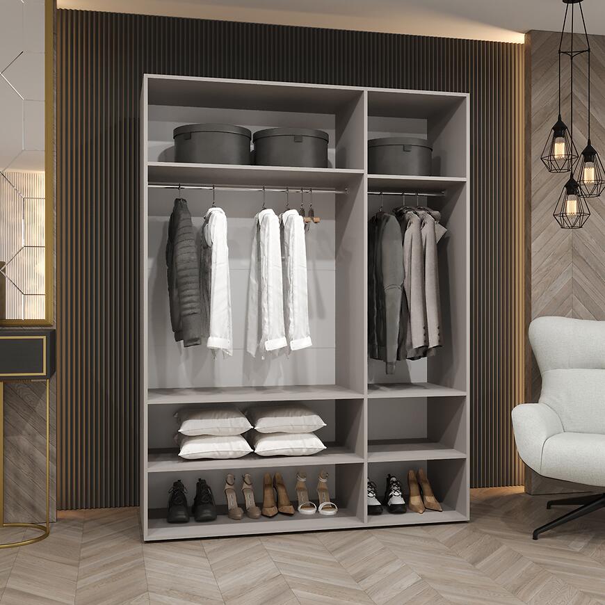 Fronty i korpus wykonane z laminowanej płyty wiórowej w wybarwieniu kaszmir tworzą jednolitą, elegancką powierzchnię. Matowa faktura podkreśla nowoczesny charakter szafy, a srebrne detale dodają subtelnego kontrastu i wyrafinowanego wyglądu. Laminowana płyta wiórowa zapewnia odporność na zarysowania i długotrwałe użytkowanie.
