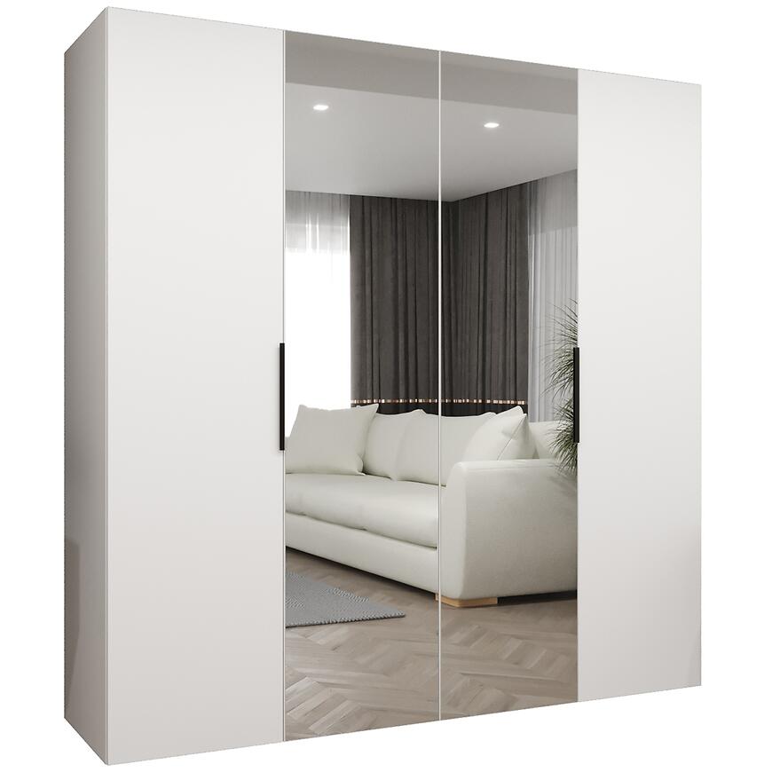 Lustro umieszczone na froncie szafy Marbella II 200 biały/czarny pełni funkcję praktyczną i wizualnie powiększa przestrzeń. Kilkudrzwiowa konstrukcja umożliwia wygodne przechowywanie ubrań, dodatków i innych przedmiotów. Brak wbudowanego oświetlenia pozwala zachować minimalistyczną formę.