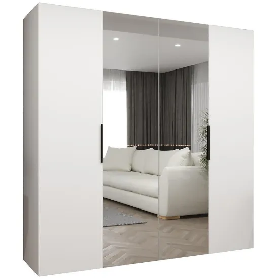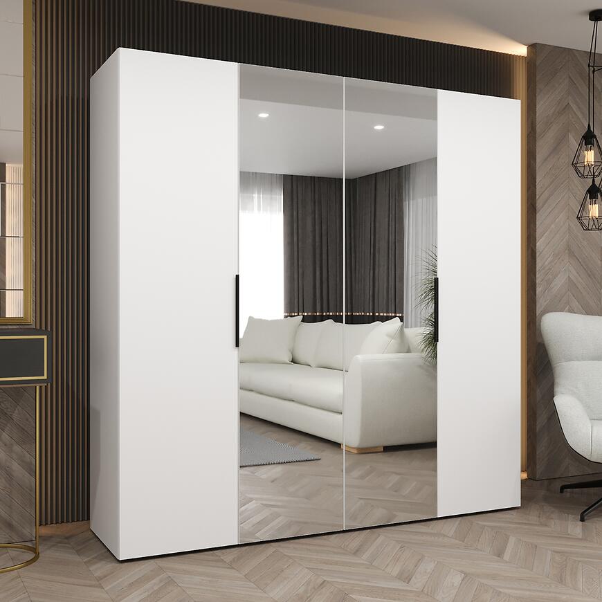 Szafa Marbella II 200 biały/czarny to przestronny, nowoczesny mebel o prostej, minimalistycznej formie. Białe wybarwienie korpusu i frontów w połączeniu z czarnymi detalami oraz matowym wykończeniem nadaje elegancki charakter, a lustro na froncie zwiększa funkcjonalność i optycznie powiększa przestrzeń. Kilkudrzwiowa konstrukcja z klasycznymi drzwiami sprawia, że szafa jest praktyczna i estetyczna.
