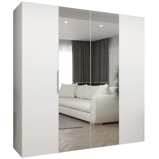 Lustro na froncie szafy Marbella II 200 biały/srebrny pełni funkcję praktyczną i optycznie powiększa przestrzeń. Kilkudrzwiowa konstrukcja umożliwia wygodne przechowywanie ubrań, dodatków i innych przedmiotów. Brak wbudowanego oświetlenia pozwala zachować minimalistyczną formę.