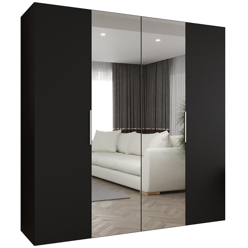 Lustro na froncie szafy Marbella II 200 czarny/srebrny pełni funkcję praktyczną i optycznie powiększa przestrzeń. Kilkudrzwiowa konstrukcja umożliwia wygodne przechowywanie ubrań, dodatków i innych przedmiotów. Brak wbudowanego oświetlenia pozwala zachować minimalistyczną formę.