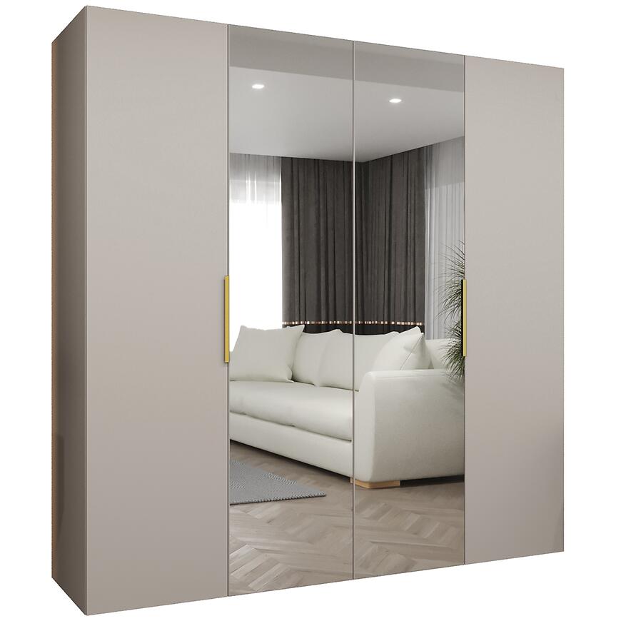 Lustro na froncie szafy Marbella II 200 kaszmir/złoty pełni funkcję praktyczną i optycznie powiększa przestrzeń. Kilkudrzwiowa konstrukcja umożliwia wygodne przechowywanie ubrań, dodatków i innych przedmiotów. Brak wbudowanego oświetlenia zachowuje minimalistyczną estetykę.