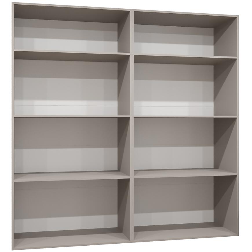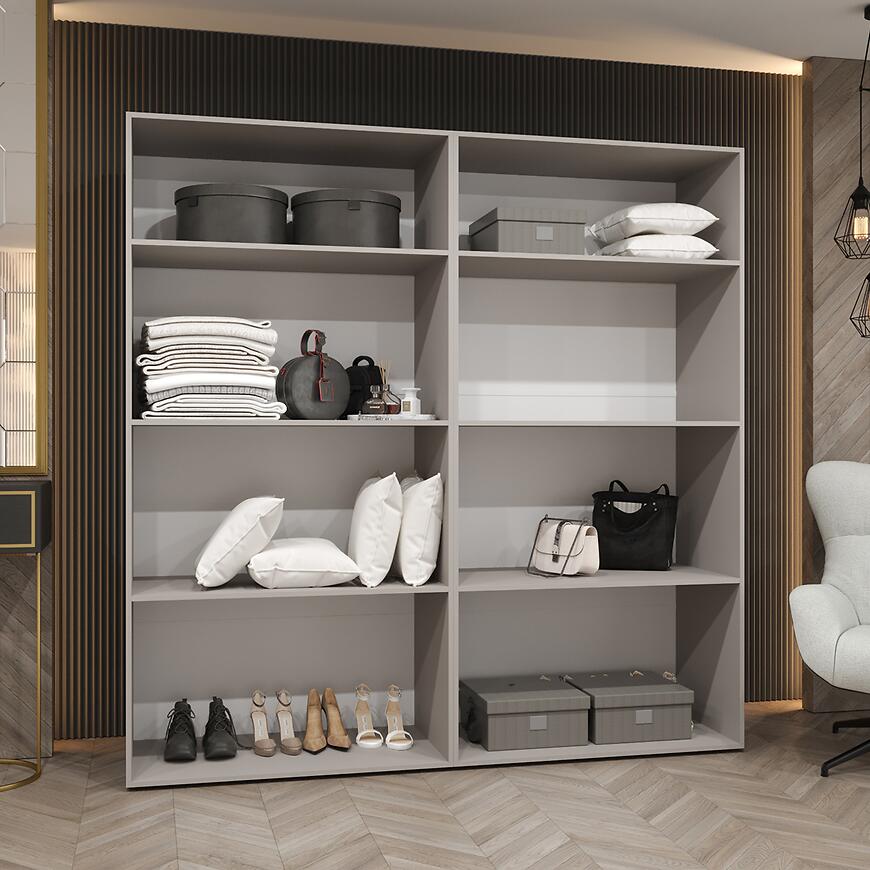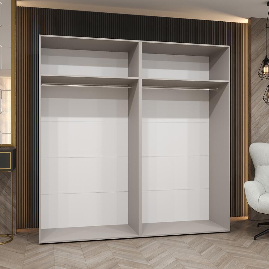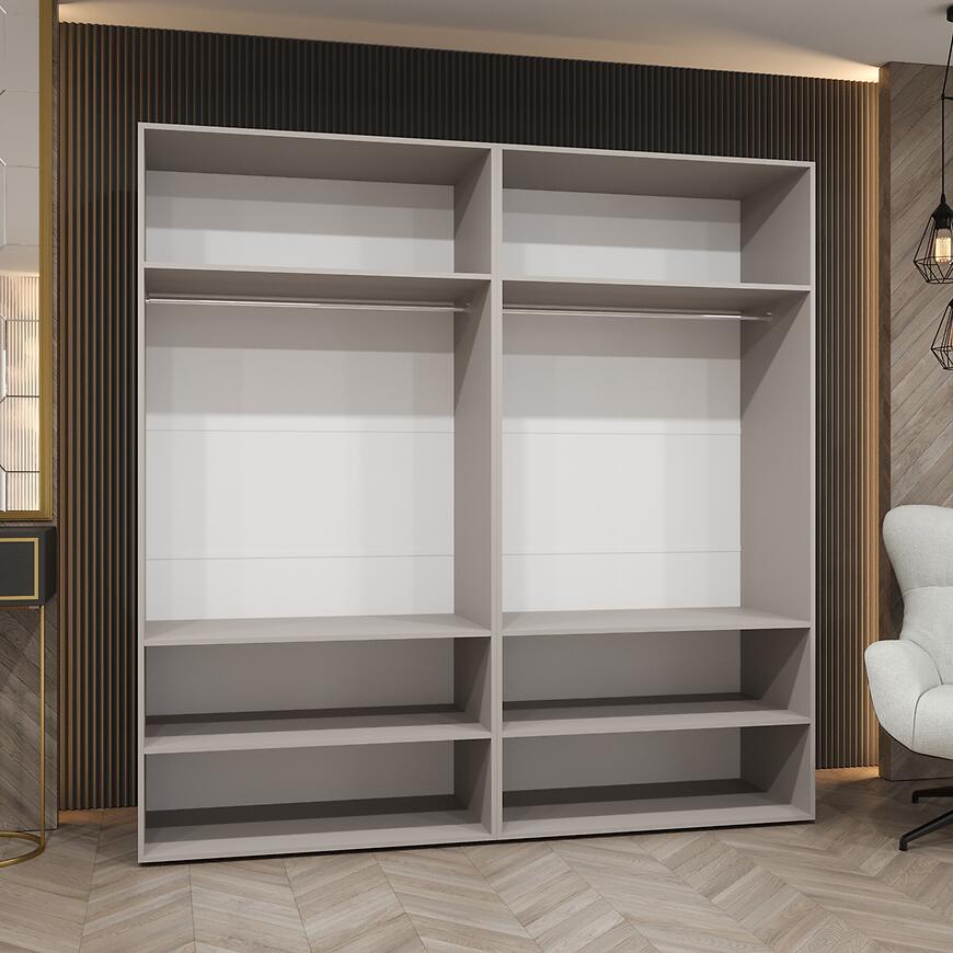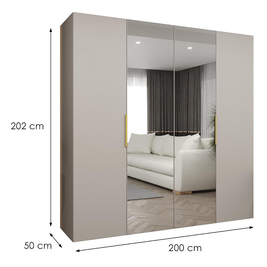 Model posiada szerokość 200 cm, wysokość 202 cm oraz głębokość 50 cm, co zapewnia dużą powierzchnię użytkową. Symetryczny układ drzwi i matowe wykończenie frontów i korpusu podkreślają nowoczesny charakter mebla.