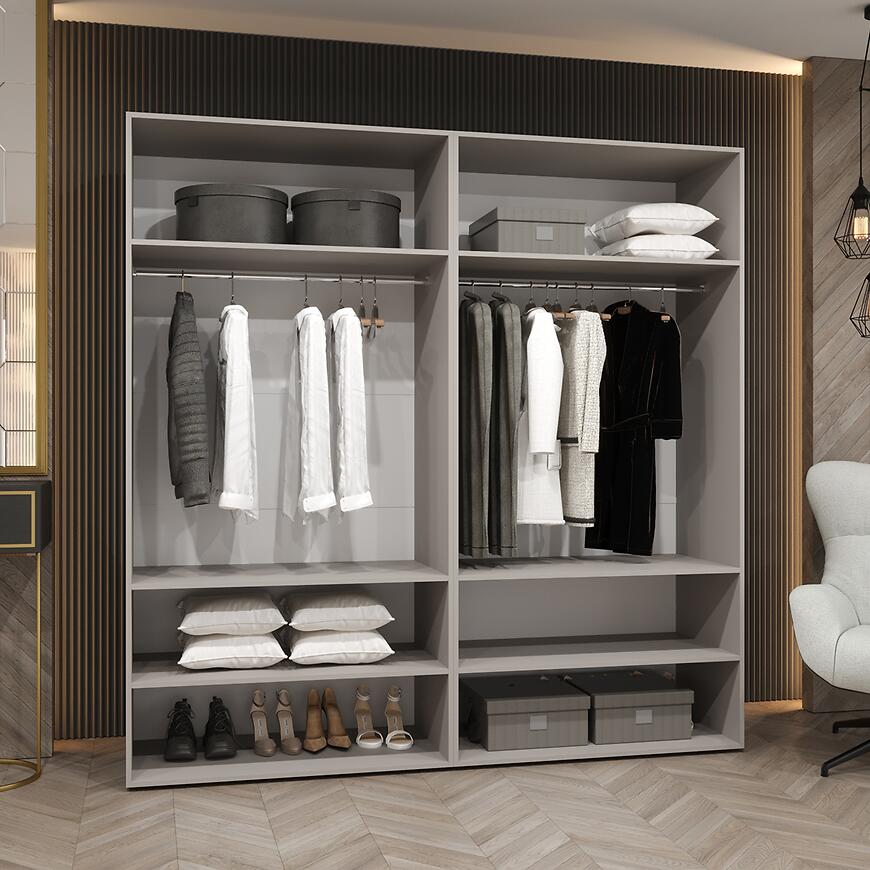 Fronty i korpus z laminowanej płyty wiórowej w kolorze kaszmir z detalami złotymi tworzą elegancką powierzchnię odporną na zarysowania. Matowe wykończenie podkreśla nowoczesny charakter szafy i zapewnia długotrwałe użytkowanie.