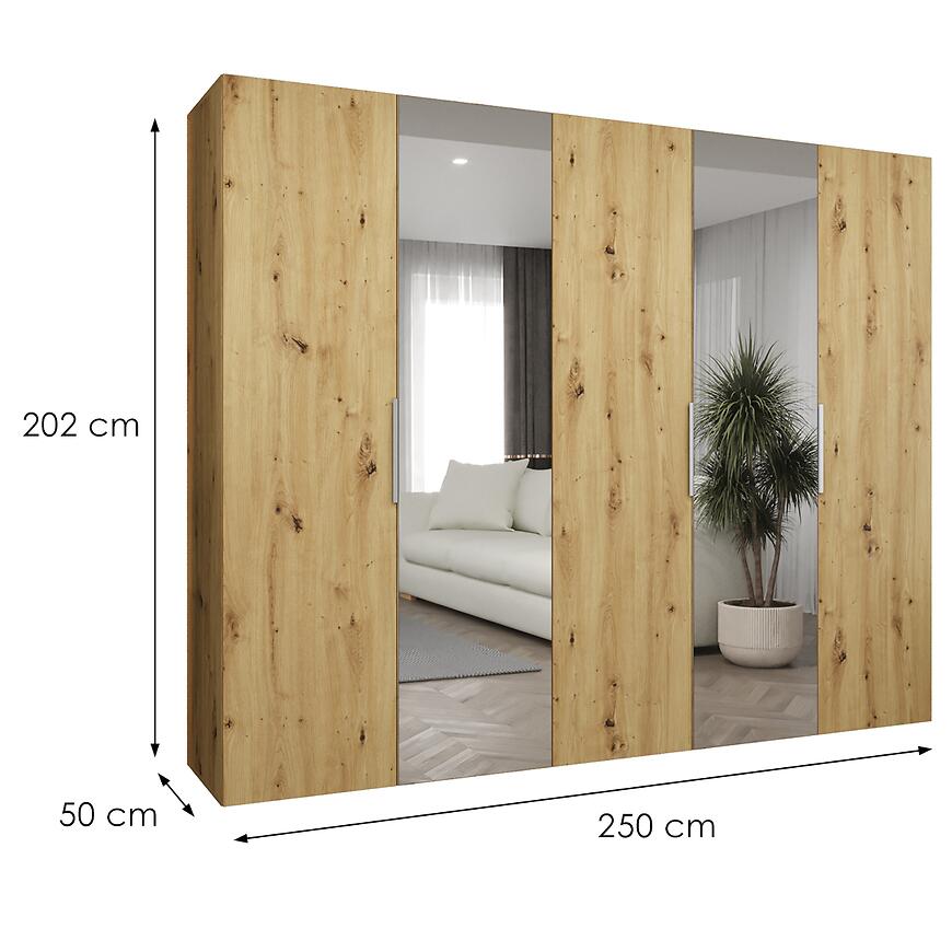 Model posiada szerokość 250 cm, wysokość 202 cm oraz głębokość 50 cm, co daje dużą powierzchnię użytkową. Symetryczny układ drzwi i minimalistyczne wykończenie podkreślają nowoczesny styl szafy.