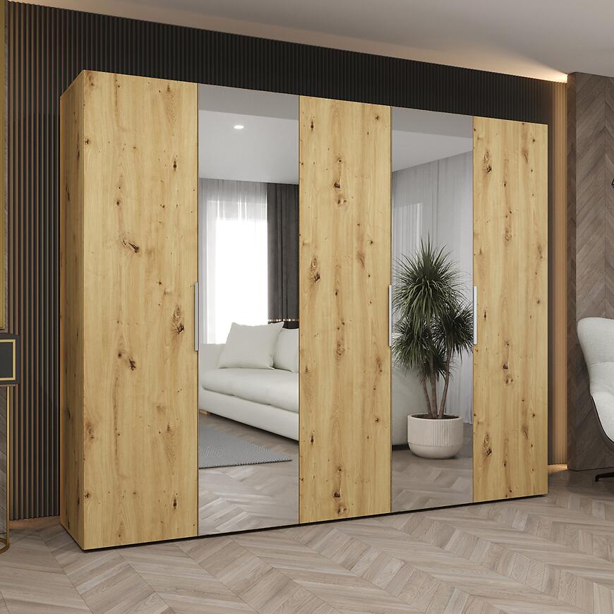 Szafa Marbella II 250 artisan srebrny to przestronny, nowoczesny mebel o minimalistycznej, prostej formie. Fronty w kolorze artisan w połączeniu z korpusem w odcieniu dąb artisan i matowym wykończeniem ze srebrnymi detalami nadają elegancki i stylowy charakter. Lustro na froncie zwiększa funkcjonalność i optycznie powiększa przestrzeń, a kilkudrzwiowa konstrukcja z klasycznymi drzwiami umożliwia wygodne przechowywanie.