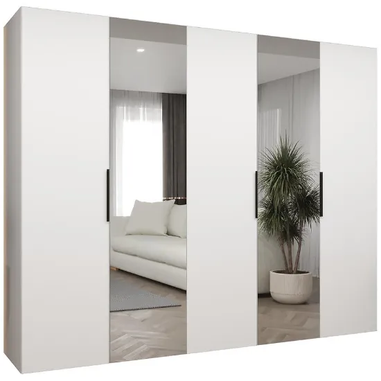 Szafa Marbella II 250 biały/czarny to przestronny, nowoczesny mebel o minimalistycznej, prostej formie. Fronty w kolorze białym w połączeniu z korpusem w tym samym odcieniu i matowym wykończeniem z czarnymi detalami nadają elegancki i stylowy charakter. Lustro na froncie zwiększa funkcjonalność i optycznie powiększa przestrzeń, a kilkudrzwiowa konstrukcja z klasycznymi drzwiami umożliwia wygodne przechowywanie.