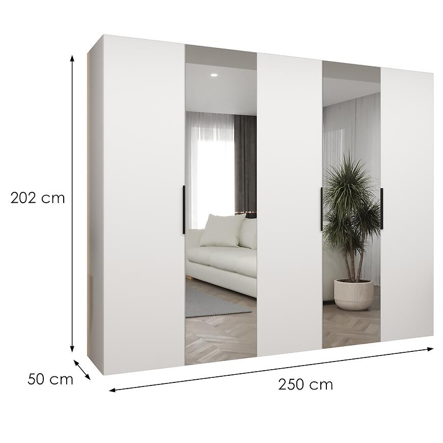 Model posiada szerokość 250 cm, wysokość 202 cm oraz głębokość 50 cm, co daje dużą powierzchnię użytkową. Symetryczny układ drzwi i minimalistyczne wykończenie podkreślają nowoczesny styl szafy.