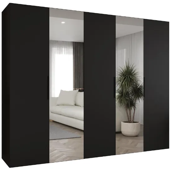 Szafa Marbella II 250 czarny to przestronny, nowoczesny mebel o minimalistycznej, prostej formie. Fronty i korpus w eleganckim, matowym czarnym wykończeniu nadają wnętrzu stylowy i wyrafinowany charakter. Lustro na froncie zwiększa funkcjonalność i optycznie powiększa przestrzeń, a kilkudrzwiowa konstrukcja z klasycznymi drzwiami umożliwia wygodne przechowywanie.