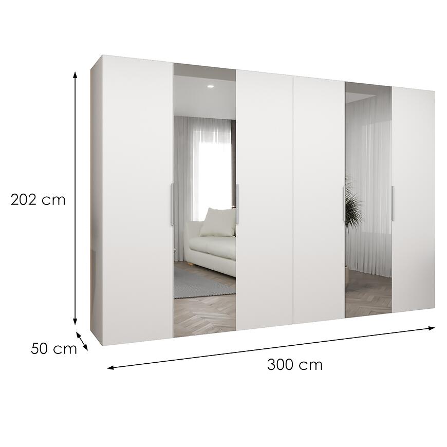 Dzięki szerokości 300 cm, wysokości 202 cm i głębokości 50 cm szafa oferuje dużą przestrzeń użytkową, pozwalając na wygodne przechowywanie wielu elementów garderoby. Matowe wykończenie frontów i korpusu sprawia, że szafa jest odporna na zabrudzenia i łatwa w utrzymaniu czystości.