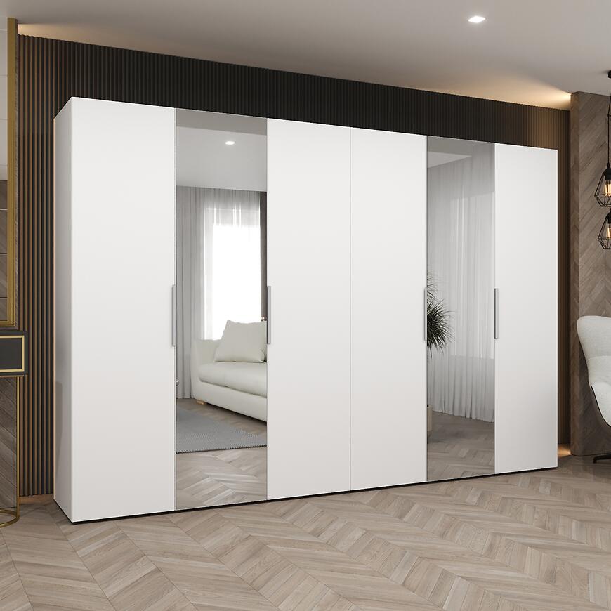 Szafa Marbella II 300 biały/srebrny to nowoczesny mebel o prostym, eleganckim kształcie. Matowe fronty w kolorze białym ze srebrnymi detalami dodają szafie stylowego charakteru, a lustro na froncie optycznie powiększa przestrzeń i ułatwia codzienne użytkowanie. Kilkudrzwiowa konstrukcja z klasycznymi drzwiami zapewnia obszerną powierzchnię do przechowywania ubrań, dodatków i akcesoriów.