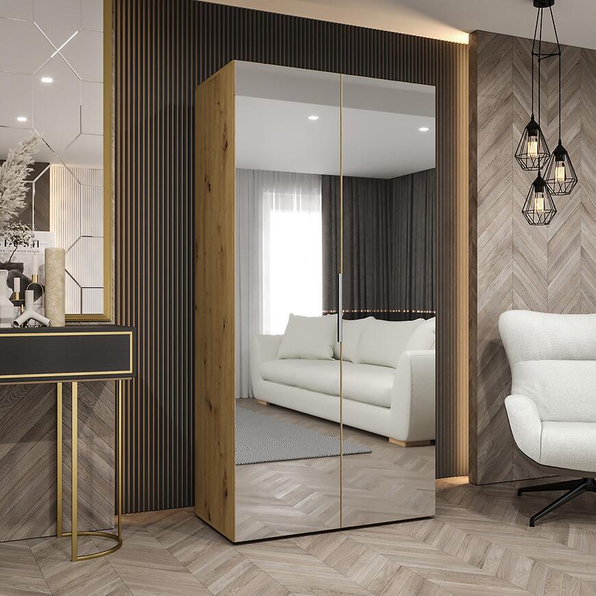 Dwudrzwiowa konstrukcja z wbudowanym lustrem nie tylko optycznie powiększa przestrzeń, lecz także zwiększa praktyczność szafy, umożliwiając wygodne przechowywanie odzieży i dodatków. Mebel jest funkcjonalny, a jednocześnie stanowi atrakcyjny element dekoracyjny.