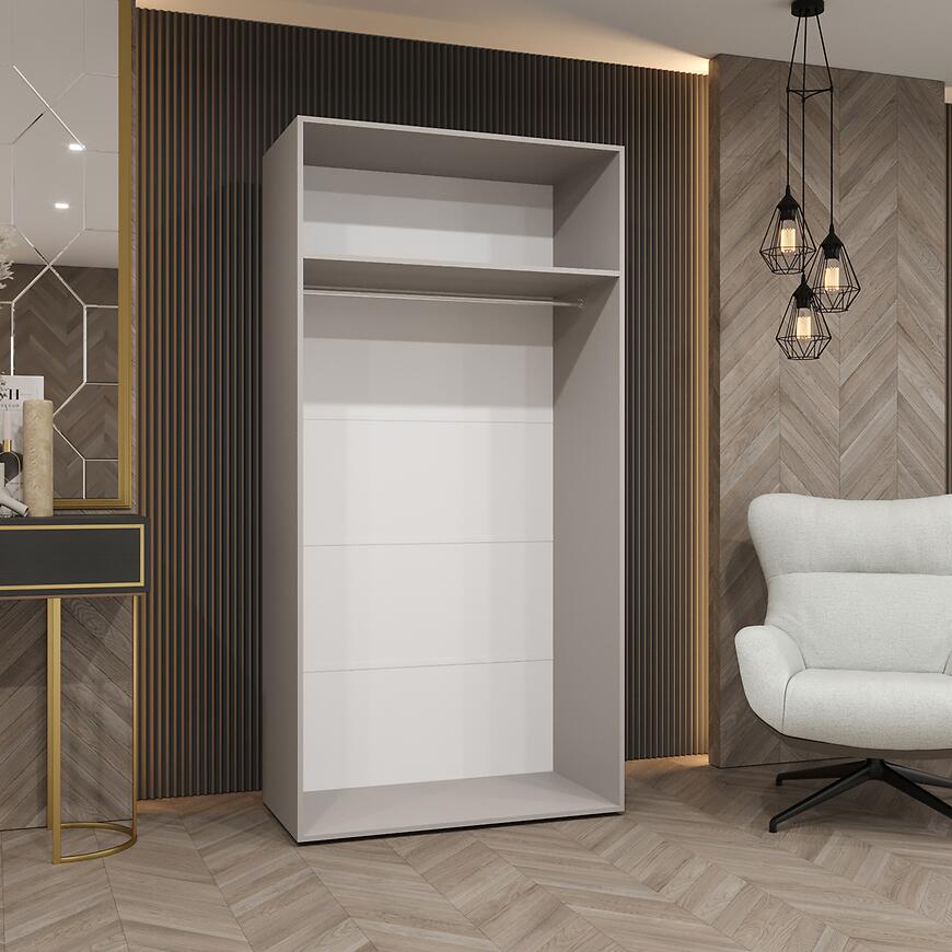 Wymiary szafy – szerokość 100 cm, wysokość 202 cm i głębokość 50 cm – zapewniają optymalne wykorzystanie przestrzeni do przechowywania przy zachowaniu proporcji, które nie przytłaczają aranżacji. To propozycja dla osób ceniących stonowaną kolorystykę, dopracowane detale i nowoczesny design.
