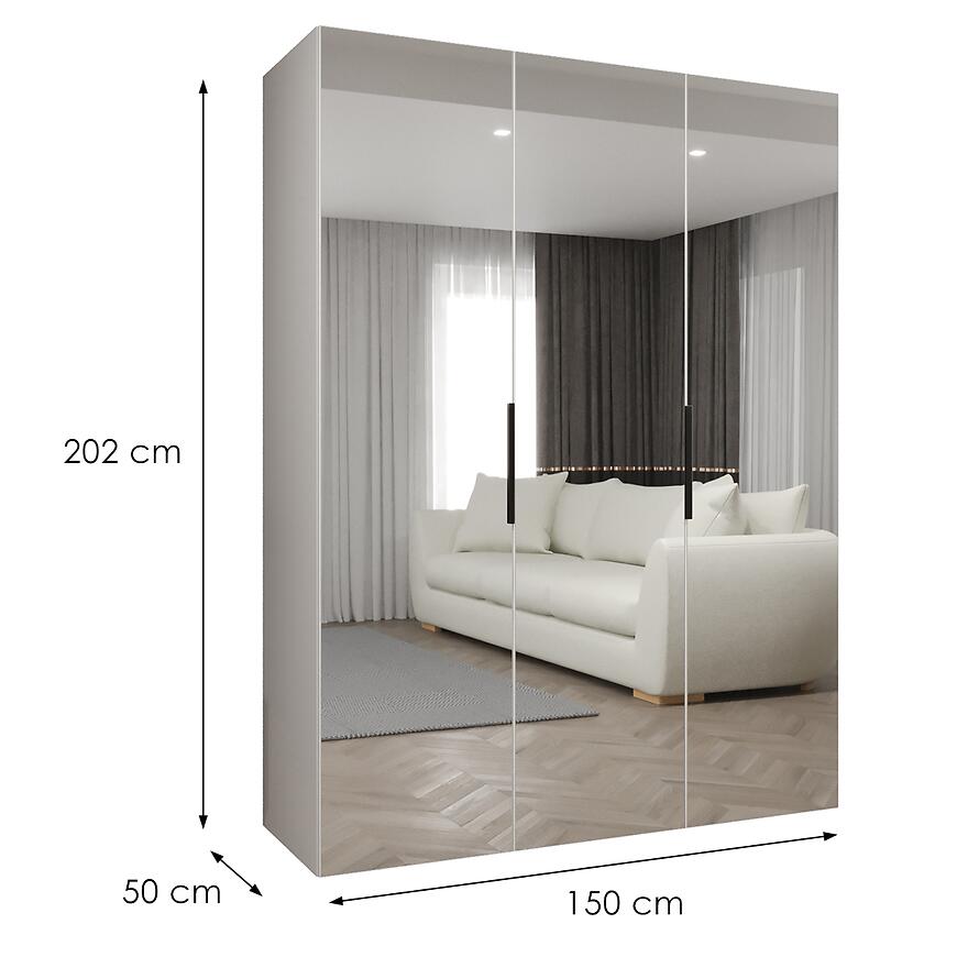 Wymiary szafy – szerokość 150 cm, wysokość 202 cm i głębokość 50 cm – zapewniają przestronność i praktyczne zagospodarowanie wnętrza, jednocześnie zachowując harmonijną proporcję bryły. To propozycja dla osób ceniących nowoczesny styl i stonowaną estetykę.