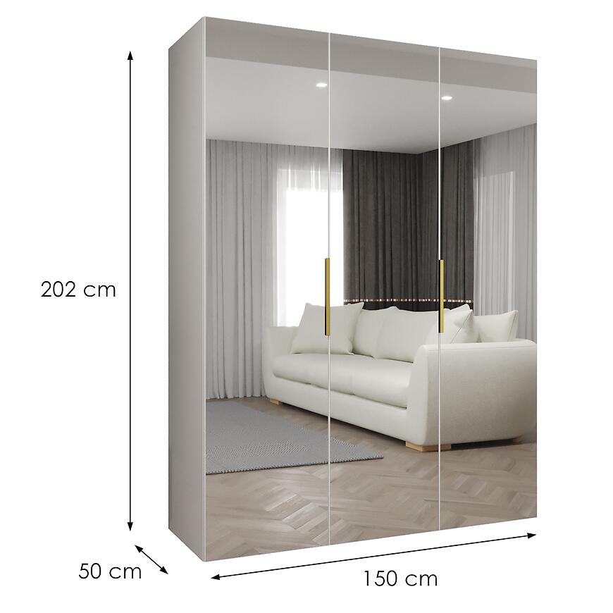 Wymiary szafy – szerokość 150 cm, wysokość 202 cm i głębokość 50 cm – zapewniają przestronność oraz funkcjonalność, przy zachowaniu harmonijnych proporcji. To propozycja dla osób ceniących nowoczesny design, estetykę i praktyczne rozwiązania.