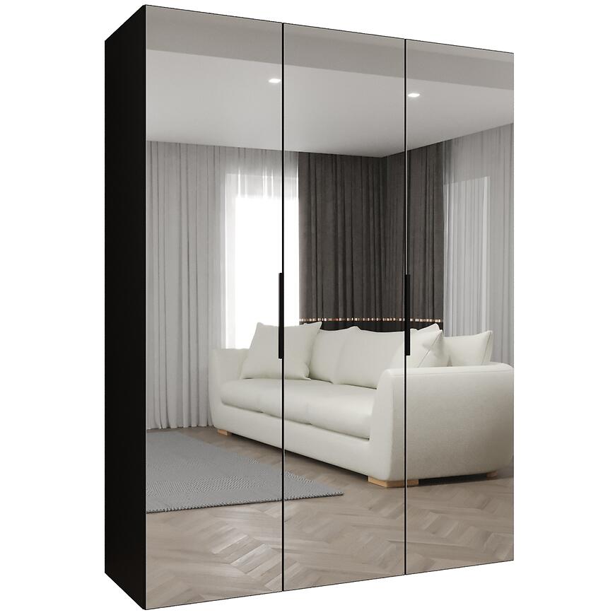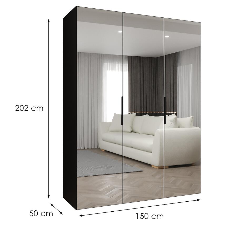 Szafa Marbella III 150 czarny to przestronny mebel o nowoczesnym designie, łączący elegancję z funkcjonalnością. Trzydrzwiowa konstrukcja z dużym lustrem zapewnia wygodną przestrzeń do przechowywania, a całkowicie czarna kolorystyka nadaje bryle minimalistyczny i wyrafinowany charakter. Matowe wykończenie frontów i korpusu podkreśla estetykę i nowoczesny styl mebla.