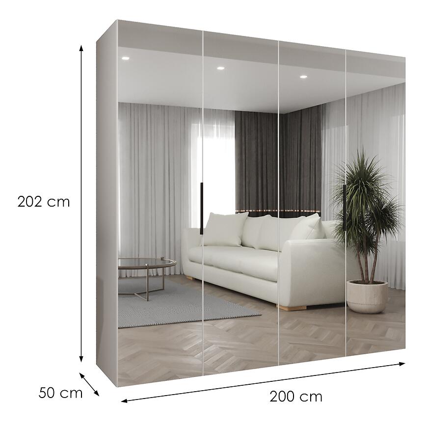 Wymiary szafy – szerokość 200 cm, wysokość 202 cm i głębokość 50 cm – gwarantują dużą pojemność i praktyczność przy zachowaniu harmonijnych proporcji bryły. To propozycja dla osób ceniących nowoczesny styl oraz funkcjonalność w eleganckim wydaniu.