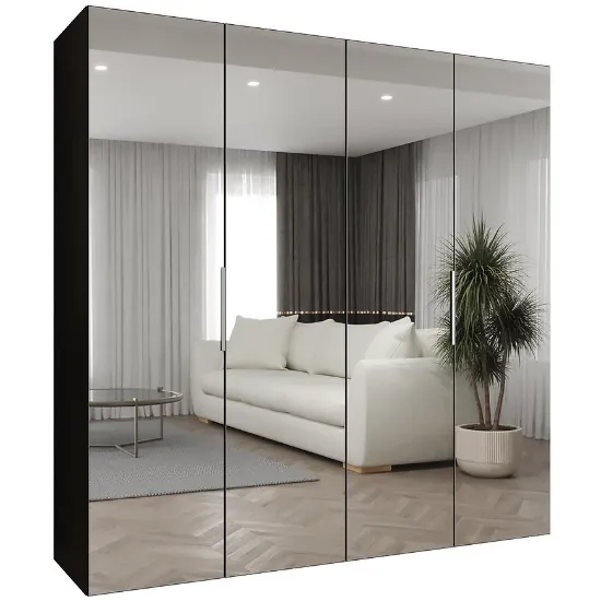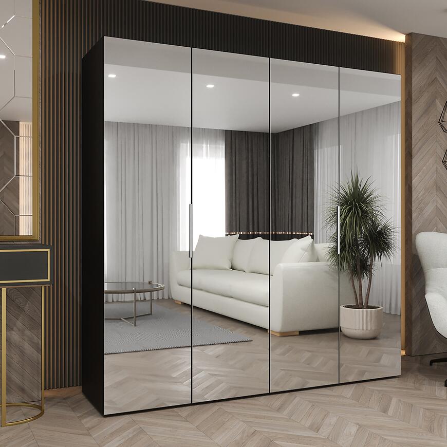 Szafa Marbella III 200 czarny/srebrny to przestronny mebel łączący nowoczesny design z eleganckim srebrnym detalem na czarnym tle. Kilkudrzwiowa konstrukcja z dużym lustrem zapewnia praktyczną przestrzeń do przechowywania, a matowe wykończenie frontów i korpusu nadaje bryle minimalistyczny i stylowy charakter.