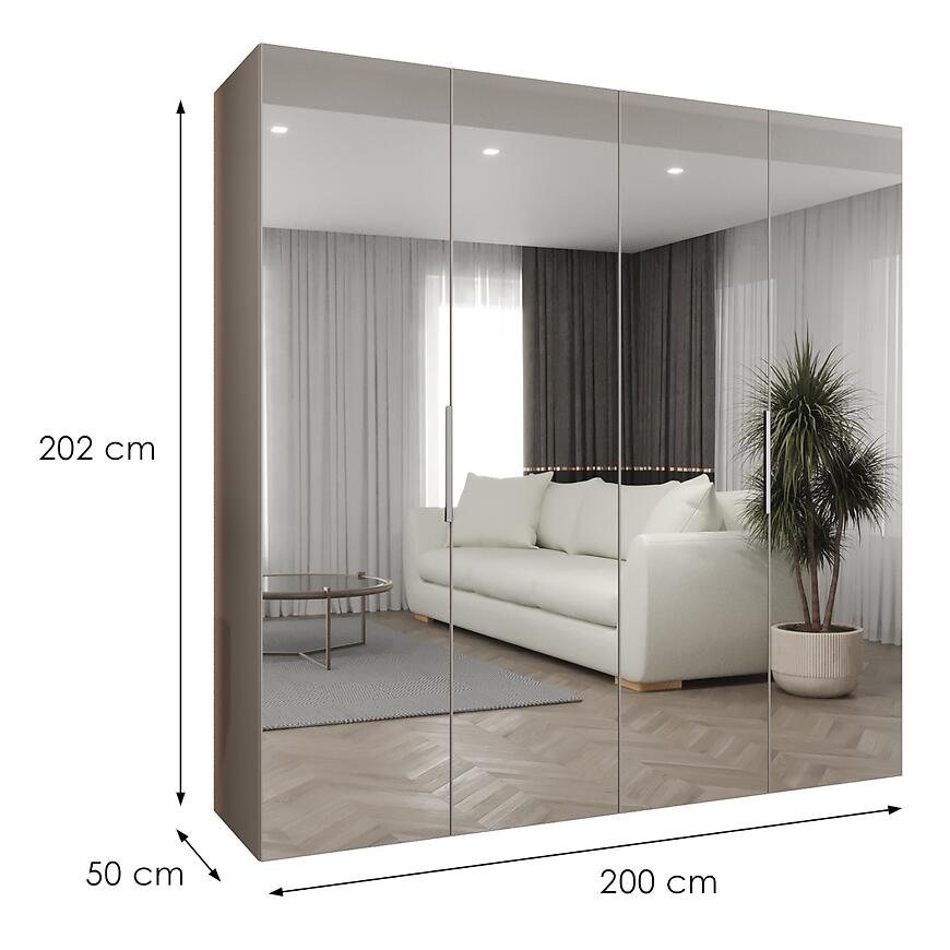 Dzięki wymiarom: szerokość 200 cm, wysokość 202 cm i głębokość 50 cm, szafa oferuje dużą pojemność i funkcjonalność przy zachowaniu harmonijnych proporcji bryły. To propozycja dla osób ceniących nowoczesny i elegancki styl w aranżacji wnętrza.