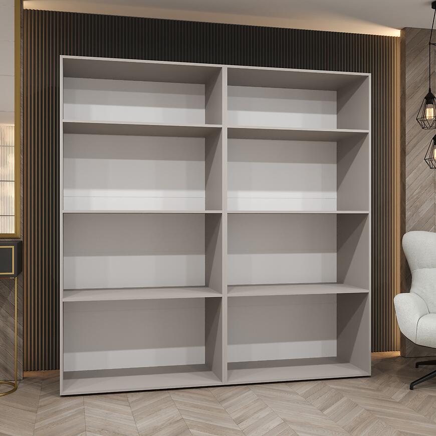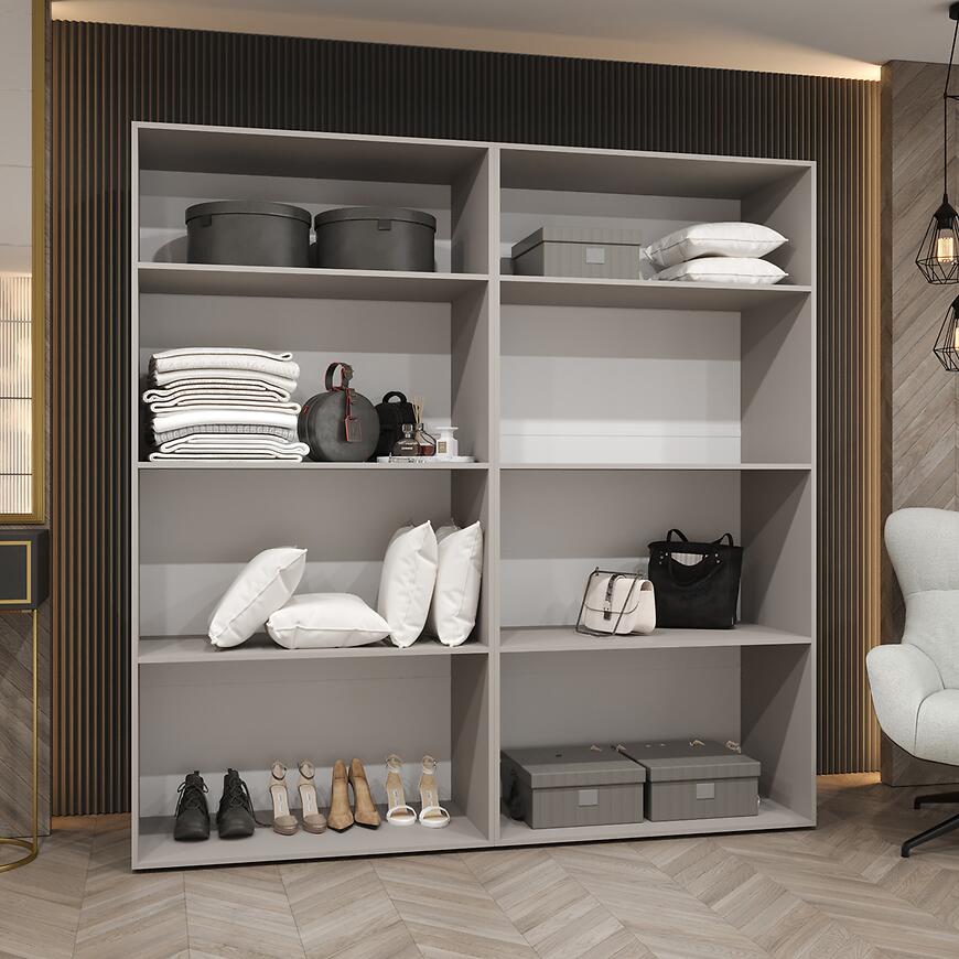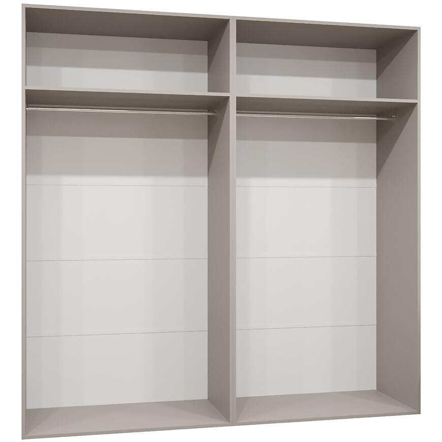 Fronty i korpus szafy utrzymane są w kolorze kaszmir, wprowadzając ciepły, neutralny ton do wnętrza. Matowe wykończenie powierzchni nadaje bryle subtelny efekt wizualny i ułatwia utrzymanie czystości. Srebrny detal wprowadza elegancję i nowoczesny akcent, podkreślając luksusowy charakter szafy.