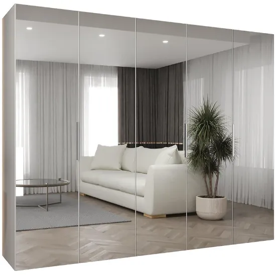 Szafa Marbella III 250 biały/srebrny to przestronny i elegancki mebel o nowoczesnym designie, łączący klasyczne białe fronty z subtelnym srebrnym akcentem. Kilkudrzwiowa konstrukcja z dużym lustrem zapewnia wygodną przestrzeń do przechowywania odzieży i dodatków, a matowe wykończenie frontów i korpusu nadaje bryle minimalistyczny, stylowy charakter.
