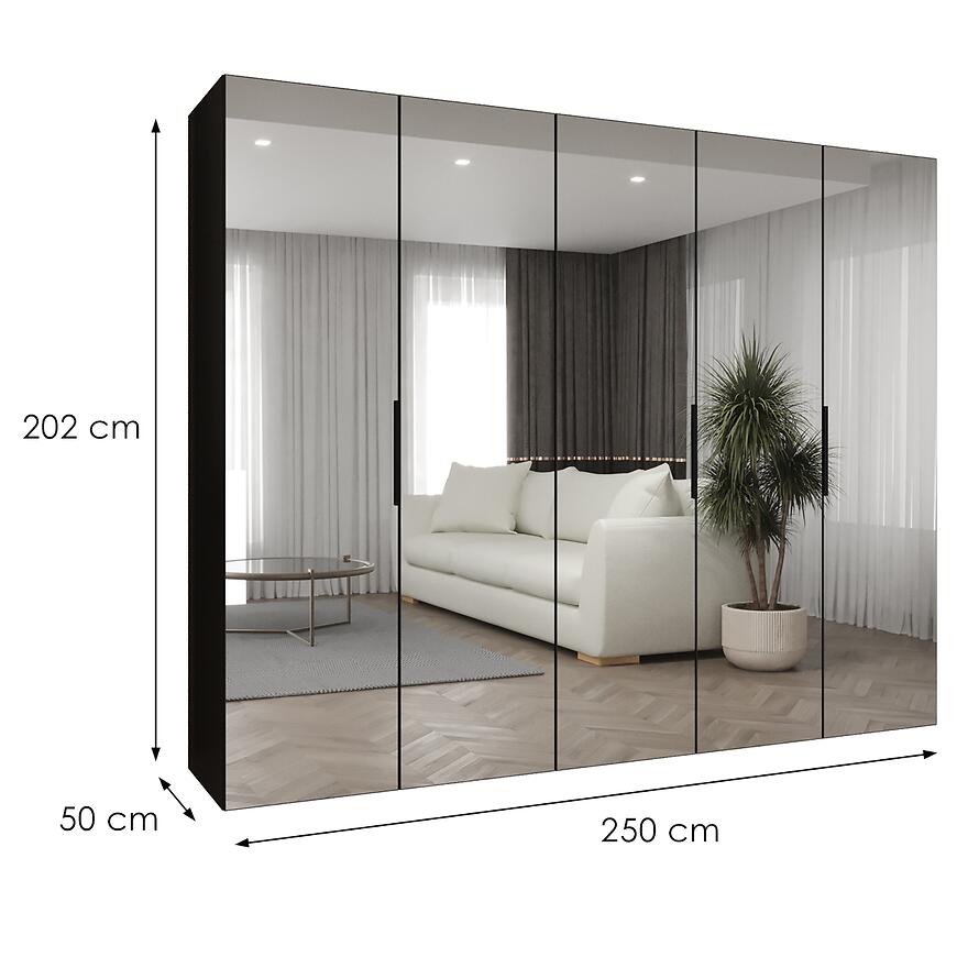 Dzięki wymiarom: szerokość 250 cm, wysokość 202 cm i głębokość 50 cm, szafa oferuje wyjątkową pojemność, umożliwiającą wygodne przechowywanie większej ilości ubrań. Harmonijne proporcje bryły sprawiają, że mebel doskonale wpisuje się w nowoczesne wnętrza.