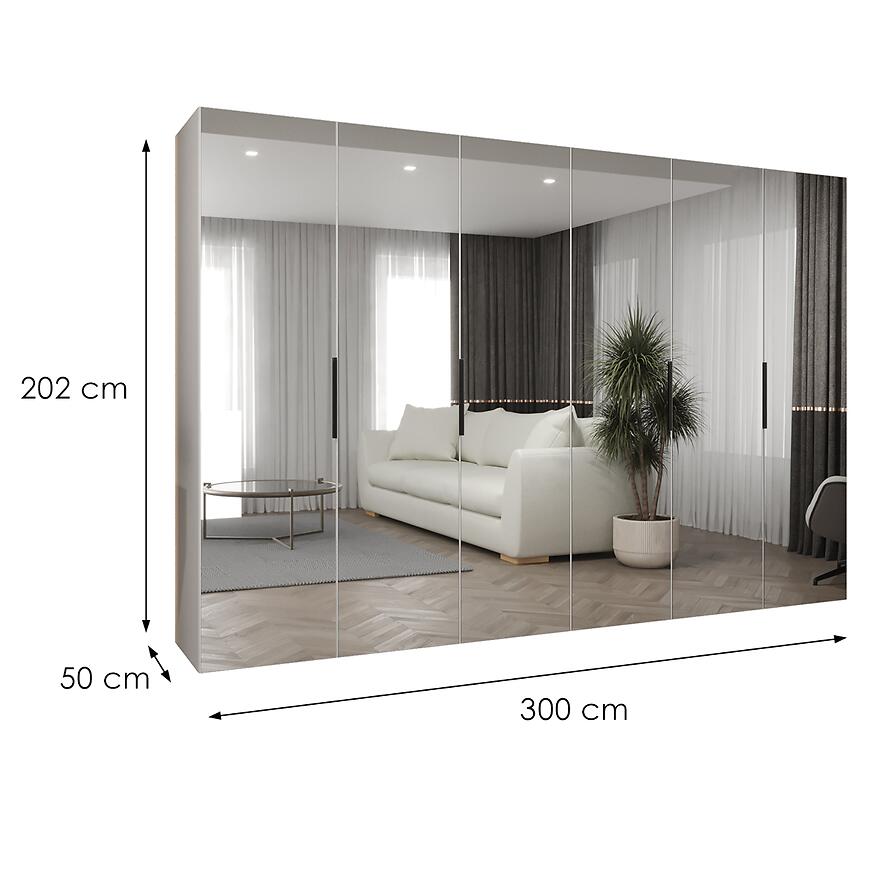 Imponujące wymiary: szerokość 300 cm, wysokość 202 cm oraz głębokość 50 cm pozwalają na swobodne uporządkowanie dużej ilości ubrań i dodatków, bez utraty wizualnej lekkości mebla.