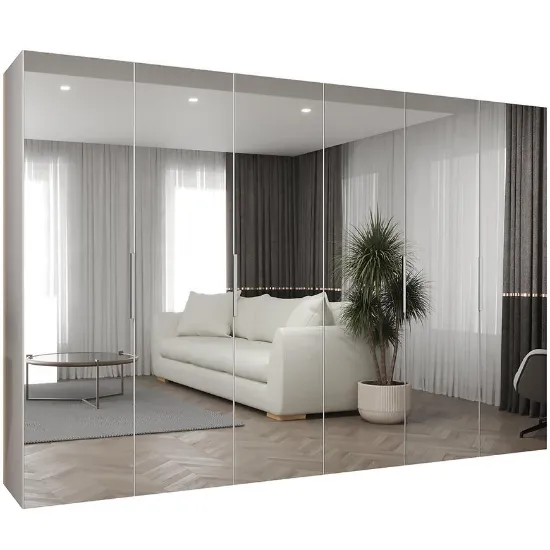 Szafa Marbella III0 Połączenie matowej bieli z delikatnym srebrnym akcentem tworzy spójną i elegancką całość, która prezentuje się lekko mimo dużych wymiarów. Kilkudrzwiowa konstrukcja z dużym lustrem zapewnia wygodę codziennego użytkowania oraz uporządkowaną przestrzeń do przechowywania.