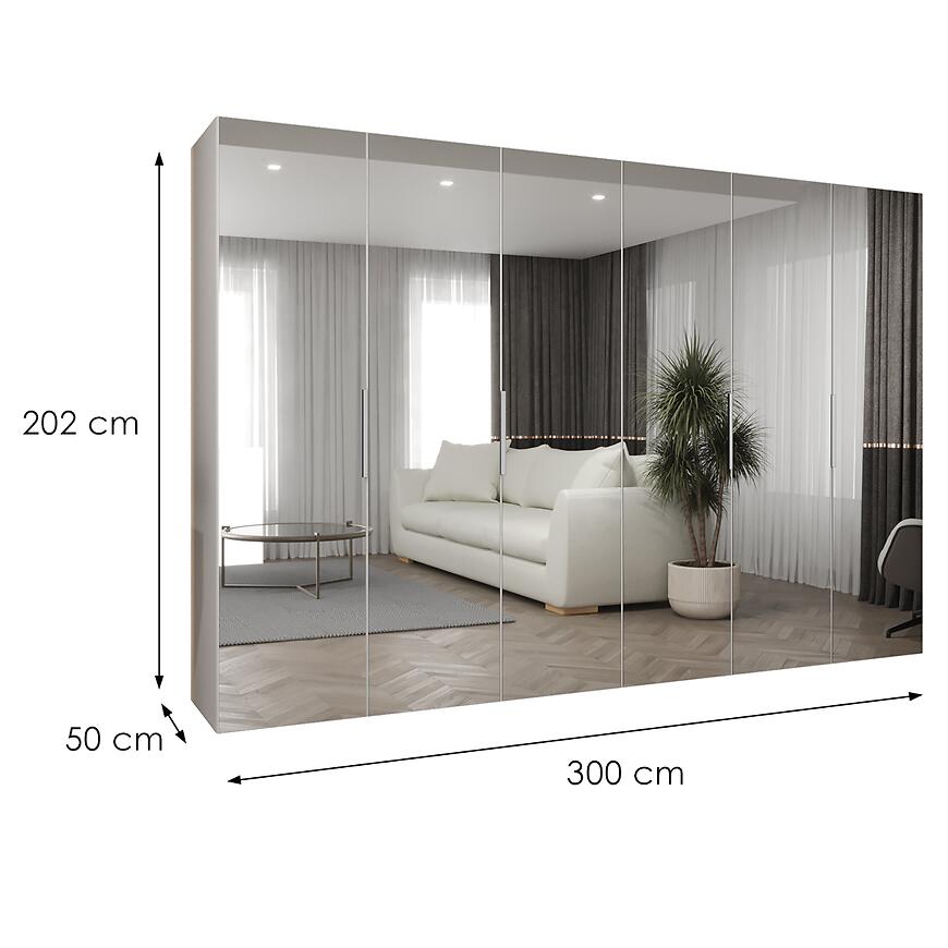Szerokość 300 cm, wysokość 202 cm oraz głębokość 50 cm pozwalają na komfortowe rozmieszczenie dużej ilości ubrań i dodatków. Prosta forma bryły podkreśla nowoczesny styl i nadaje całości harmonijny wygląd.
