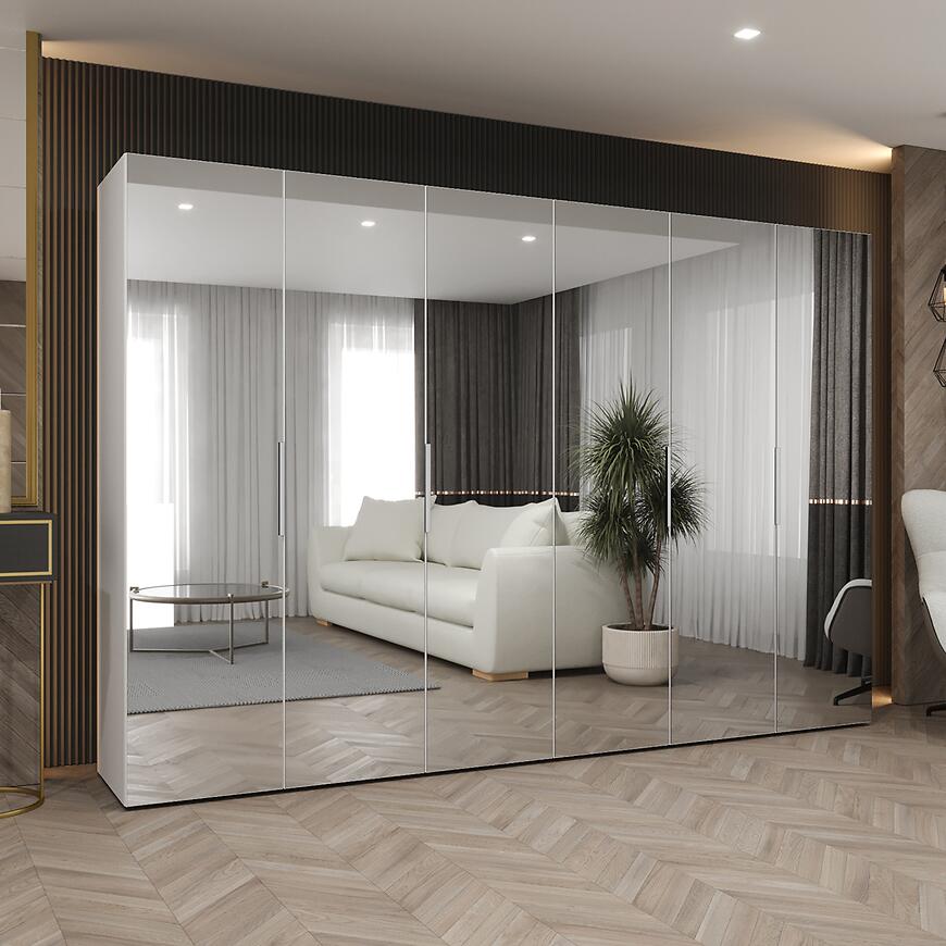 Biała szafa z lustrem i srebrnym detalem – subtelna elegancja