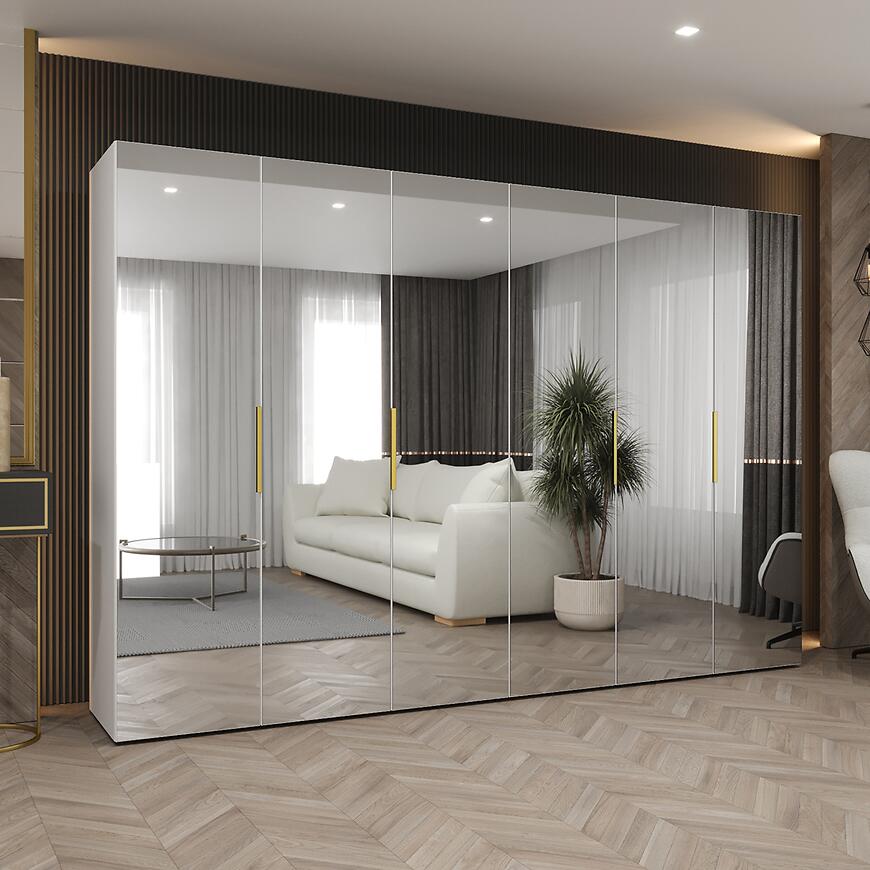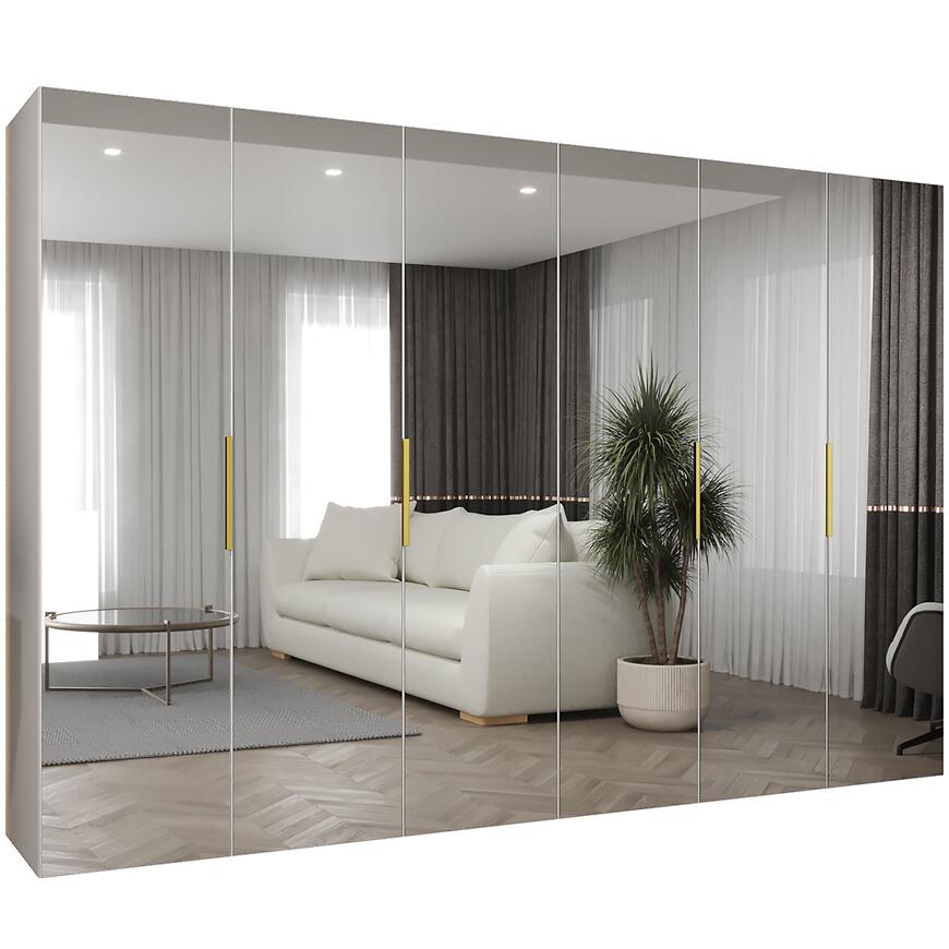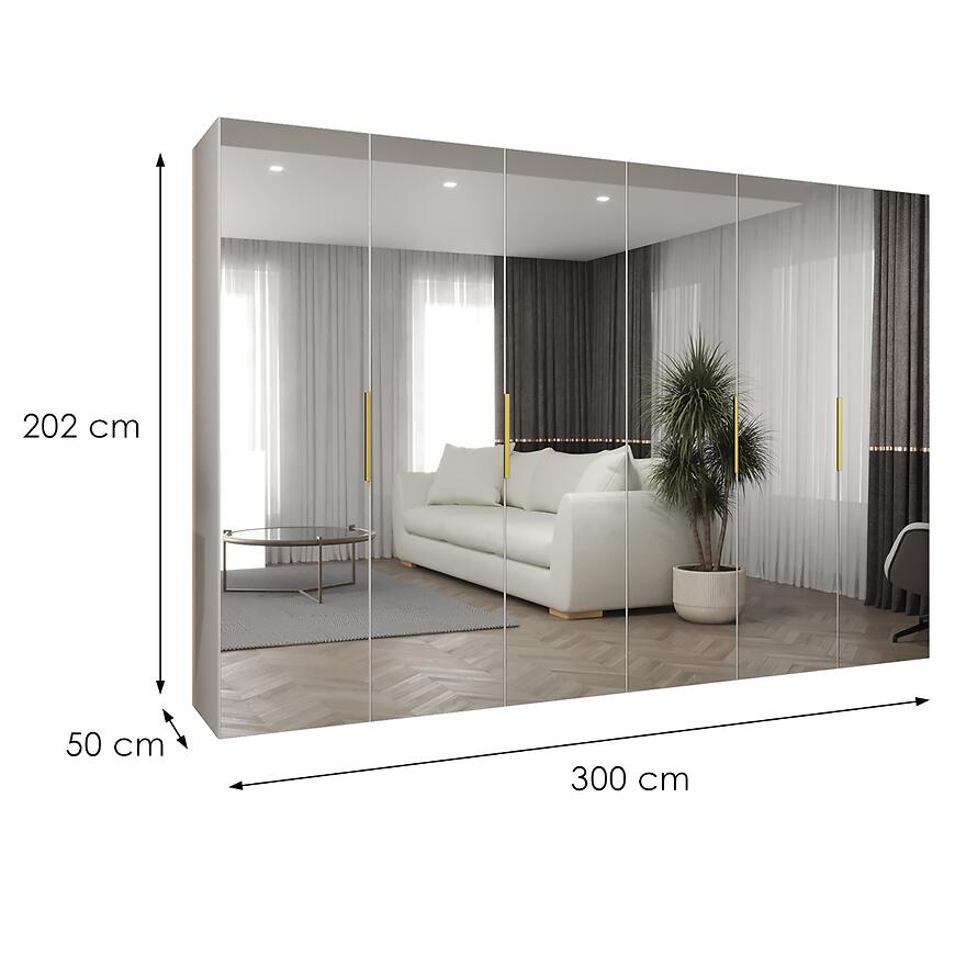 Szafa Marbella III 300 biały/złoty to bardzo pojemny i elegancki mebel, który łączy jasną, matową biel z wyrazistym złotym akcentem. Kilkudrzwiowa konstrukcja z dużym lustrem zapewnia komfortową przestrzeń do przechowywania, a prosta forma bryły podkreśla nowoczesny charakter całości. Szafa prezentuje się lekko i estetycznie, mimo imponującej szerokości.