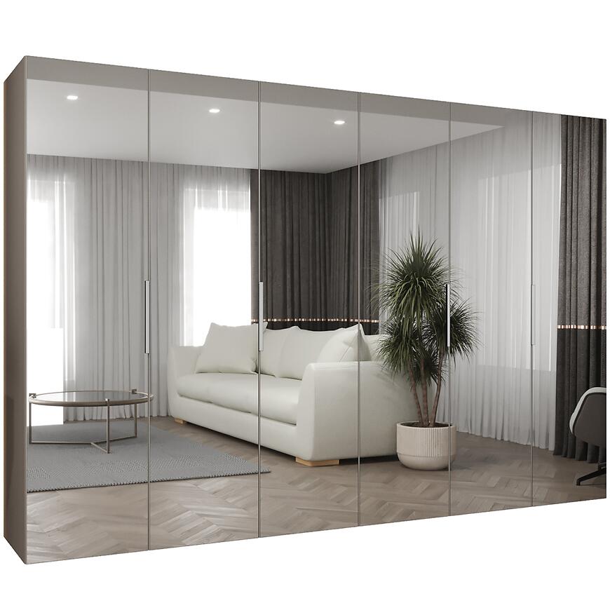 Szafa Marbella III 300 kaszmir/srebrny to przestronny mebel łączący ciepły odcień kaszmiru z subtelnym srebrnym akcentem. Matowe wykończenie nadaje szafie nowoczesny charakter, a wbudowane lustro zwiększa funkcjonalność, odbijając światło i optycznie powiększając wnętrze.